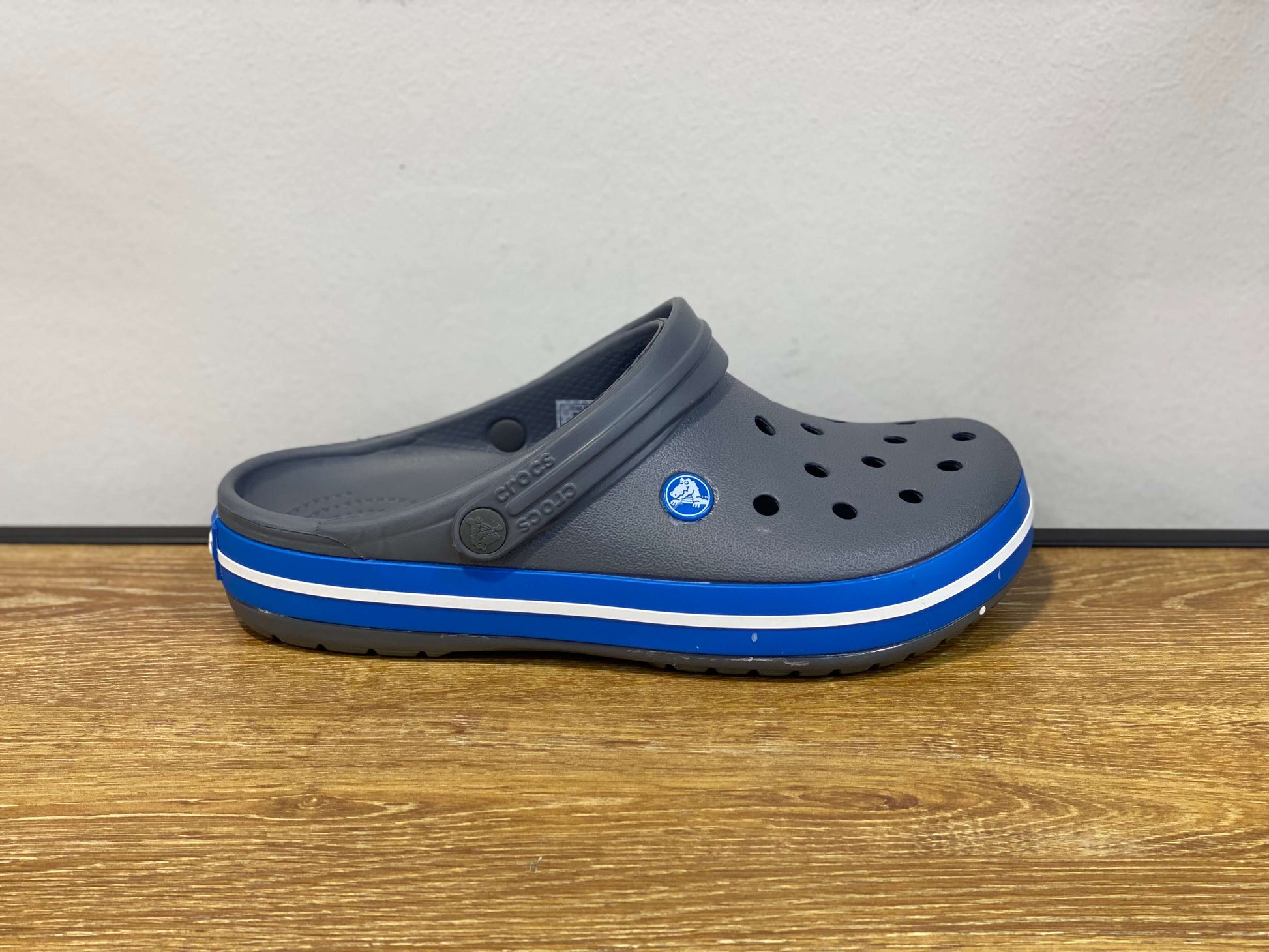 Crocs Crocband gris et bleu avec un trait blanc