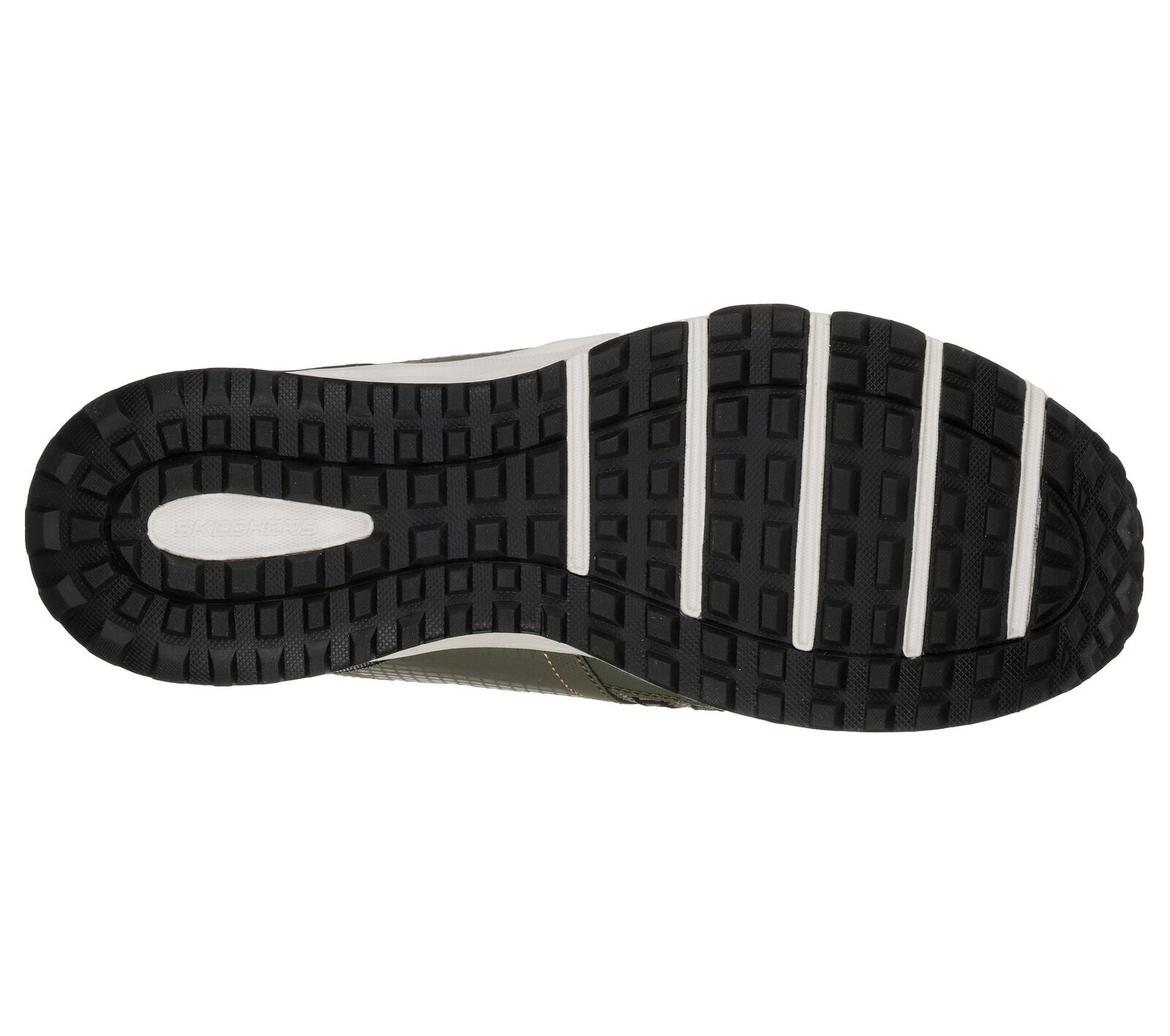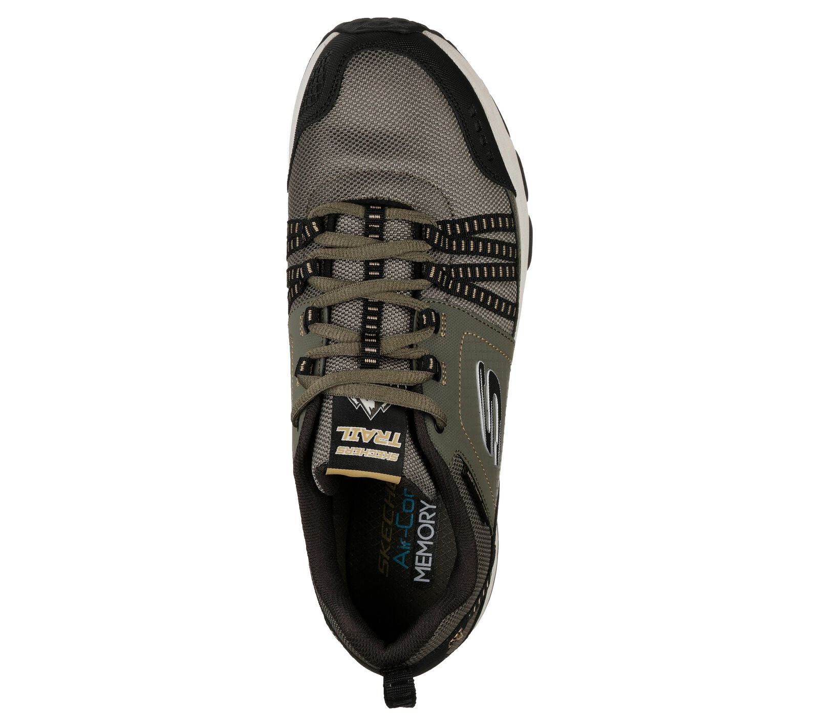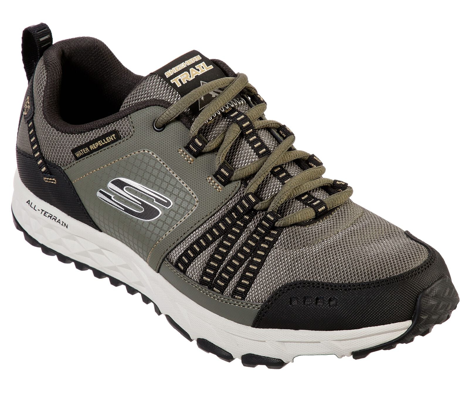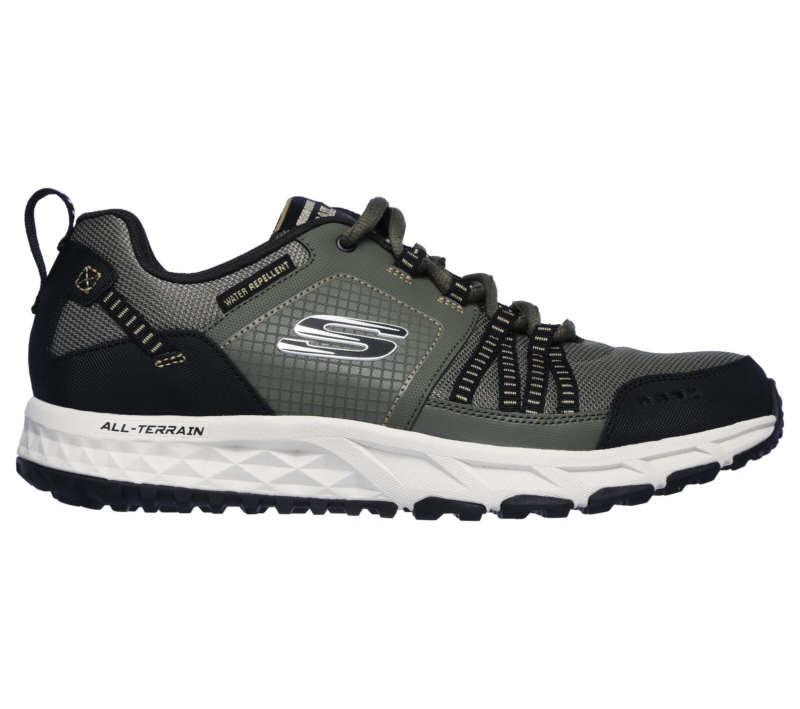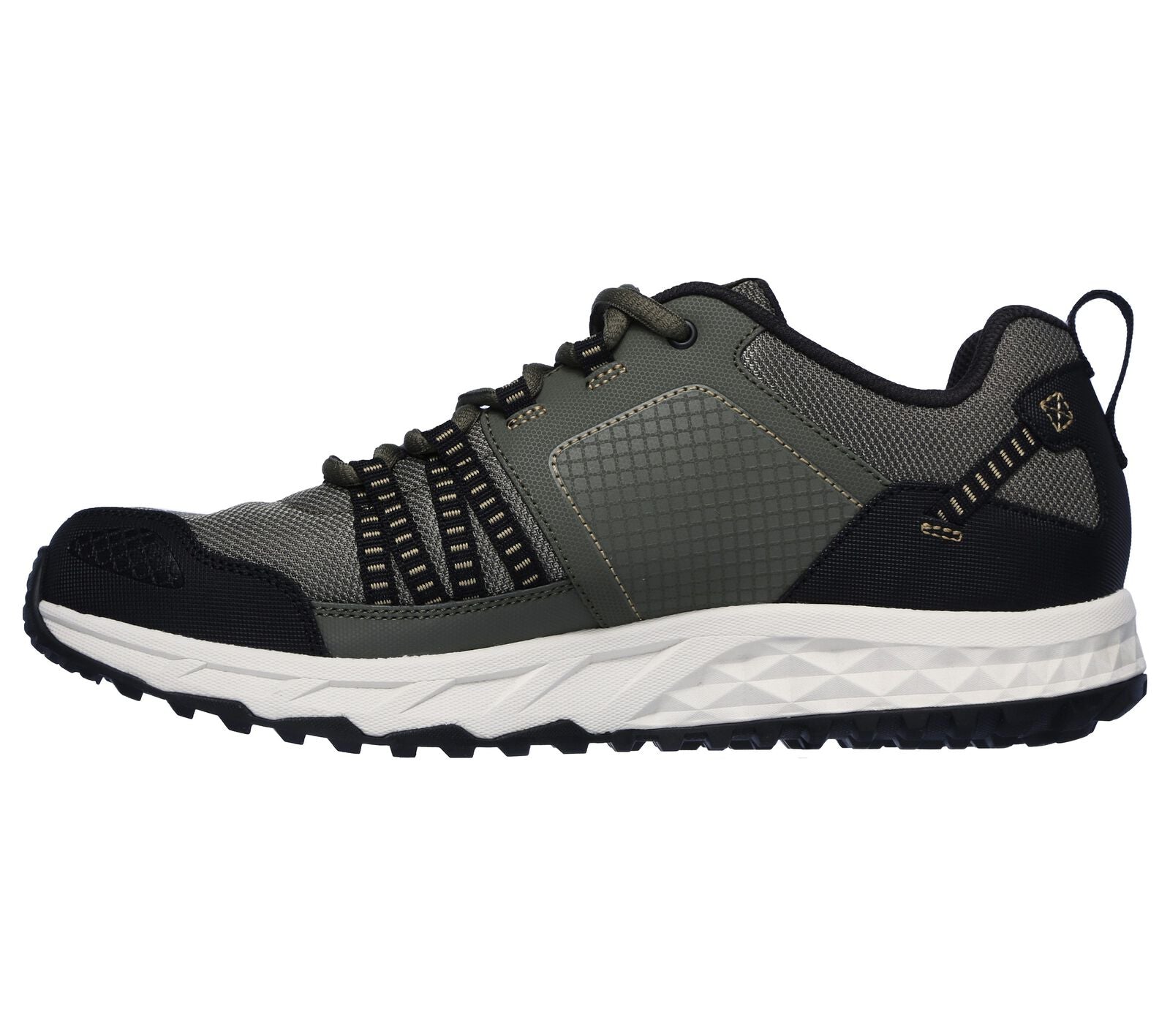 Apprivoisez le terrain avec style et confort avec la chaussure SKECHERS Escape Plan. Tige en cuir, synthétique et tissu maillé dans une chaussure de marche et d'entraînement athlétique à lacets avec surpiqûres, superpositions et perforations. Semelle intérieure en mousse à mémoire de forme refroidie à l'air.