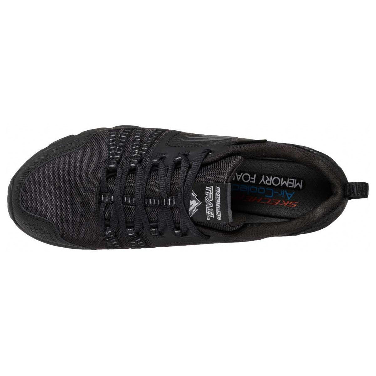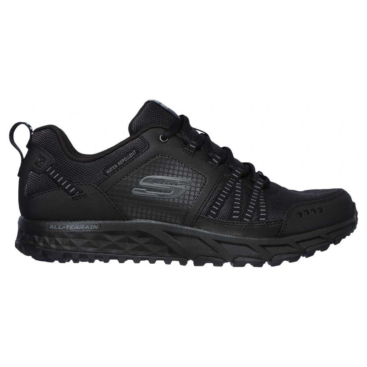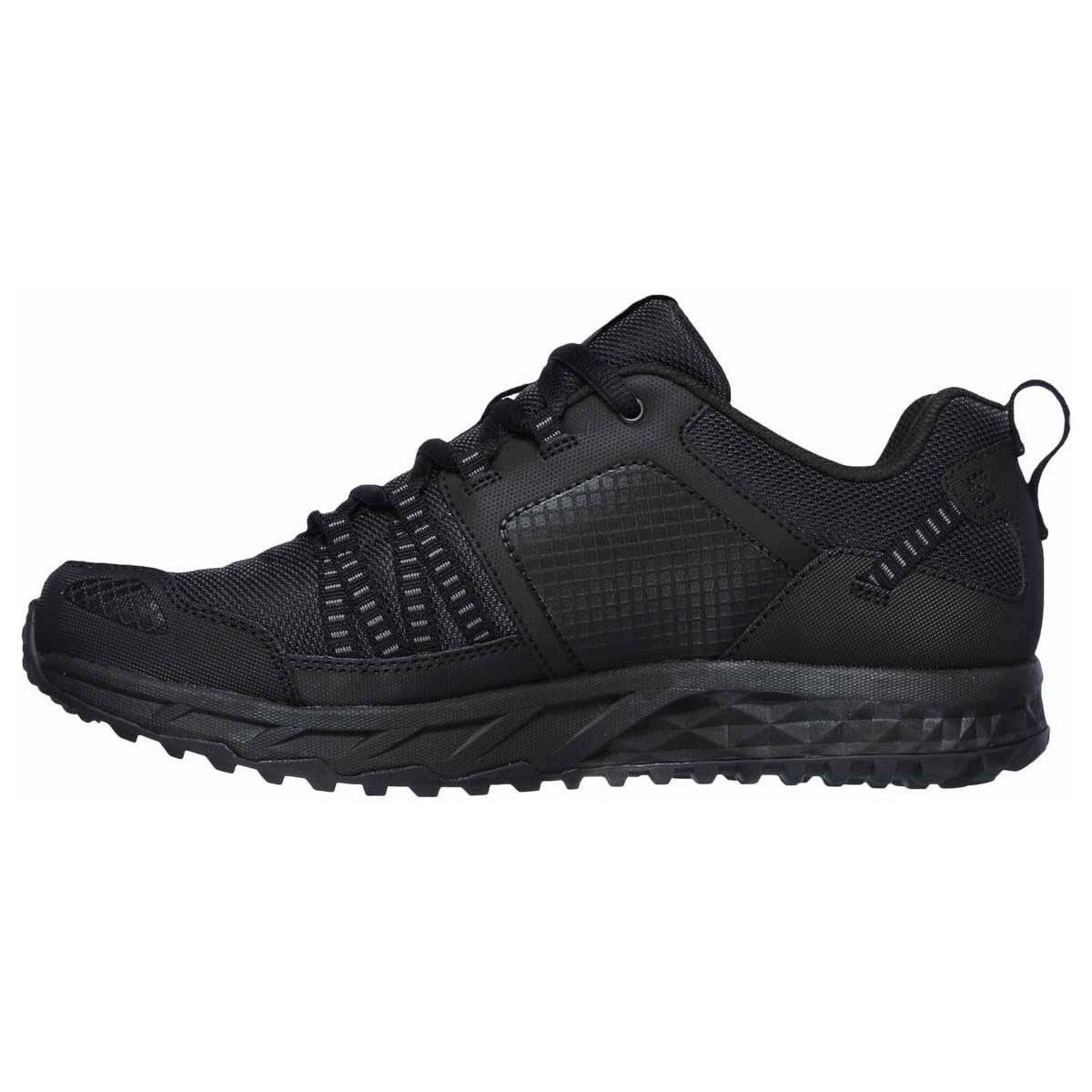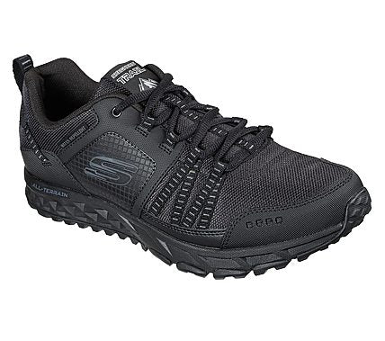 Apprivoisez le terrain avec style et confort avec la chaussure SKECHERS Escape Plan. Tige en cuir, synthétique et tissu maillé dans une chaussure de marche et d'entraînement athlétique à lacets avec surpiqûres, superpositions et perforations. Semelle intérieure en mousse à mémoire de forme refroidie à l'air.